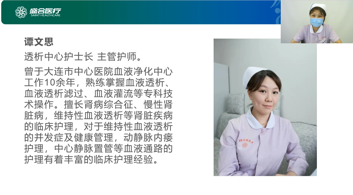 “腎合有道”第一期直播一經(jīng)開播就得到了腎病患者的廣泛關(guān)注,直播間氣氛活躍,直播觀眾熱情高漲。大連盛合醫(yī)院透析中心護(hù)士長、主管護(hù)師譚文思,向大家講述“透析患者如何通過容量管理達(dá)到身體最佳舒適度”這一主題,將血液透析容量相關(guān)特點和大家分享,引導(dǎo)患者在直播間積極互動提問。